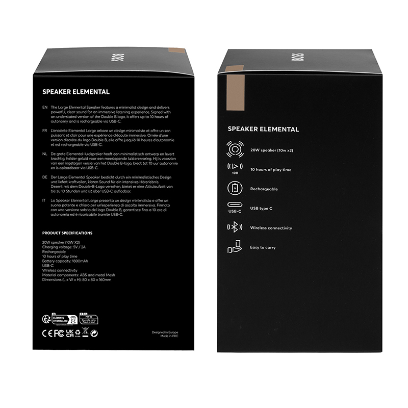 Il Logo della doppia B incorona il pulsante di controllo principale, mentre la sottile firma BOSS completa il design. Con un’uscita chiara e coinvolgente da 20 W (2×10 W), il diffusore offre dieci ore di autonomia e una comoda ricarica USB-C.
