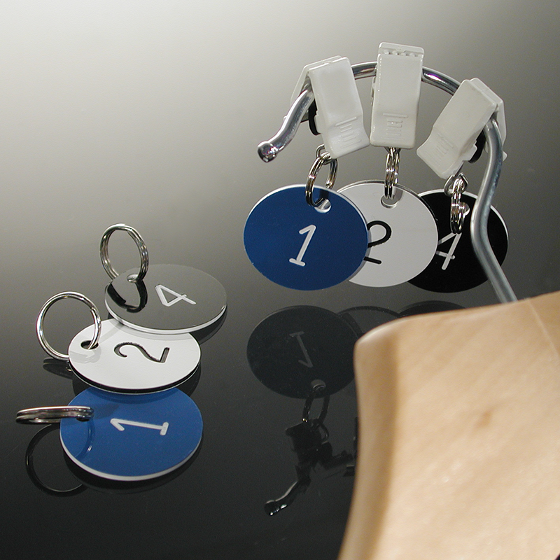 Doppio Dischetto per contrassegno guardaroba con anelli a spirale e pinzetta.