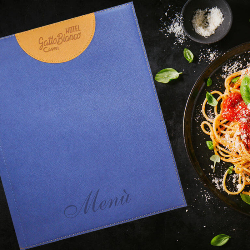 Portamenù o Carta dei Vini in Ecopelle in vari materiali e colori per fogli A/4.